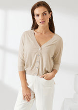 The Natalya Cardi from Mia Fratino features a flattering V neckline, 5 button closure, elbow length sleeves and ribbed trim detail. Crafted from a premium cotton, silk and cashmere blend fabrication, this classic cardigan is a lightweight knit for all seasons.