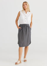 SH23154The Khari Skirt from Shanty Corporation features an elasticised waistband with draw string, side pockets and a curved hemline. This knee length skirt is crafted from a linen blend fabrication that is breathable and ideal for everyday wear.