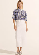 The Adage top is crafted in a lightweight cotton blend, features a high neck stand collar and covered buttons leading into a gathered bodice and sleeve. Small side splits give permission to wear this piece either tucked in or out. a spring stable offering style and versatility.