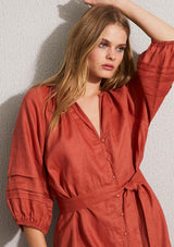 The Etch Dress from Zoe Kratzmann features a button through, mid-length dress with pin-tuck detailing and delicate embroidery. The sleeves are a balloon design that finish at 3/4 length. Crafted from Ramie, a non-stretch fabrication.